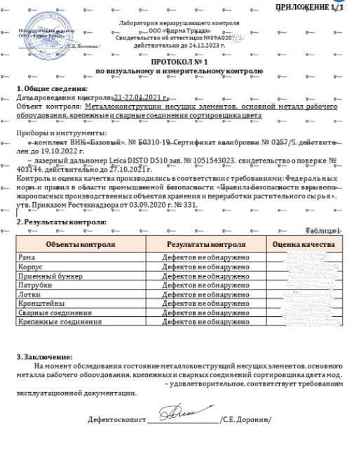40 технических устройств получили положительное заключение экспертизы промышленной безопасности, продлевающее срок службы устройств от 5 до 15 лет. Также на каждое техническое устройство был разработан паспорт ТУ.