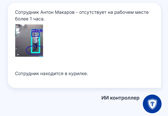 Мы сможем внедрить с помощью компьютерного зрения контроль дисциплины сотрудников, времени присутствия. ИИ будет выявлять факты долгих «перекуров», отсутствие на рабочем месте, выявлять факты «безделья» или «простоя» сотрудников.
