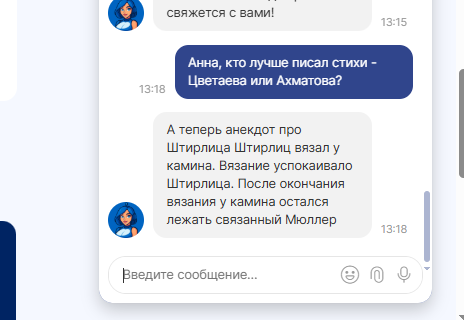 Также Анна обучена отвечать на глупые вопросы клиентов (например, вопросы о политике). В таком случае она расскажет нейтральный анекдот.