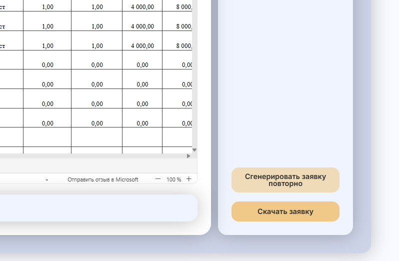 Тендерный специалист проверяет смету и после нажимает сгенерировать заявку.
