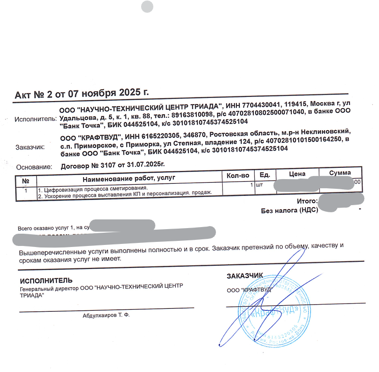 От клиента было получено благодарственное письмо и с его разрешения публикуем фотографию закрытого акта о выполнении работ.